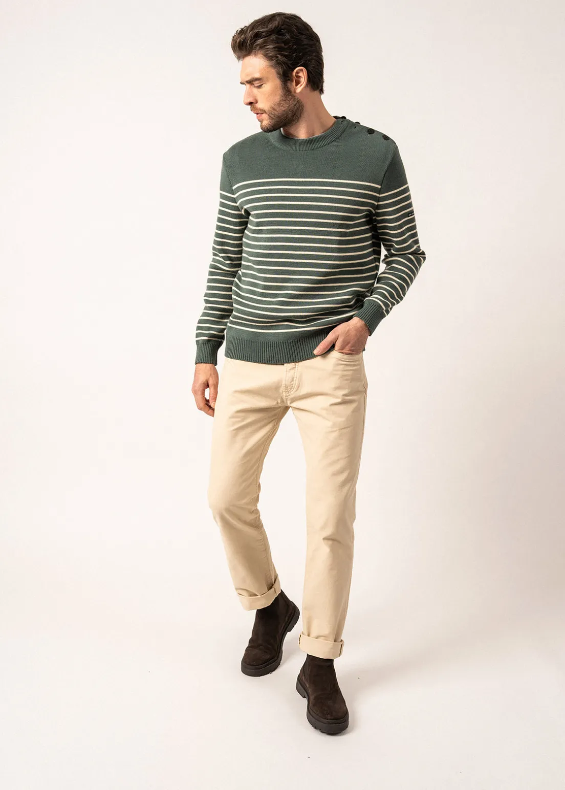 Binic is a jumper directly inspired by authentic sailor jumpers. It features the iconic stripes found on striped sailor shirts, as well as shoulder buttoning on one side. A timeless, comfortable jumper.- 1×1 rib knit