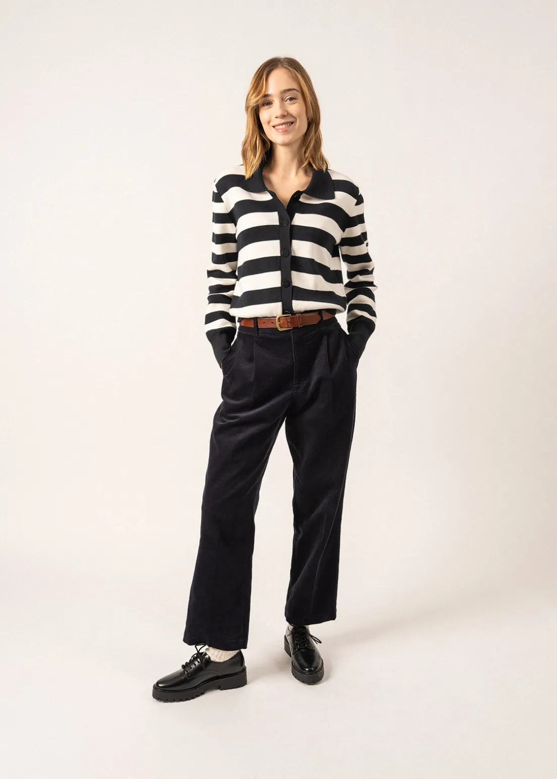 Knitted in Ponti, the Galway vest presents elegance and structure. We love its play of stripes, wider on the body, recalling our marine heritage. Made from a blend of cotton and cashmere, it is both lightweight, soft and comfortable.- Striped waistcoat