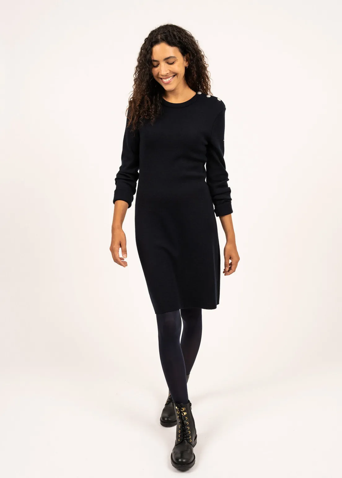 Knitted in our Atelier, the Grande Marée dress is made in merino wool. Inspired by our iconic sailor jumper, it is a timeless, elegant piece, for a feminine look.- 1×1 rib knit