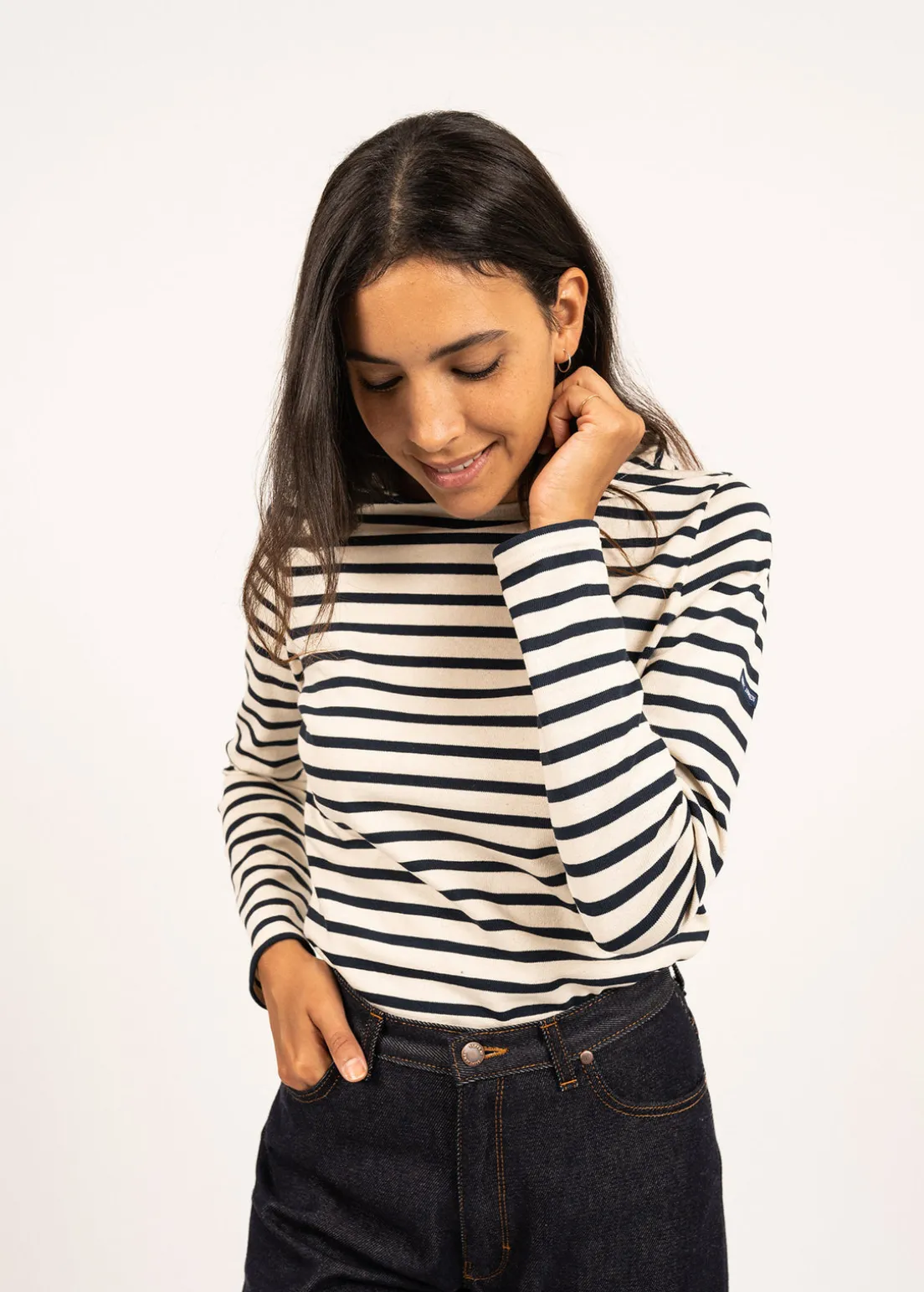 With its authentic fabric in carded cotton, the Meridame shirt is the feminine version of the original striped sailor shirt. With its round neckline and regular fit, it is a comfortable piece, easy to wear.- Thick jersey