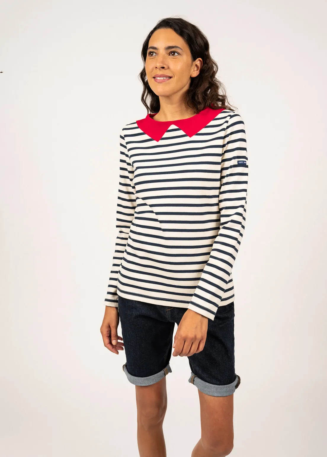 Inspired by our iconic heavy cotton sailor shirts, the Vire model stands out with its inset red collar. A lovely way to reinterpret the traditional sailor shirt and expand the collection for those who cherish our timeless stripes.- Sailor striped shirt, Méridien quality