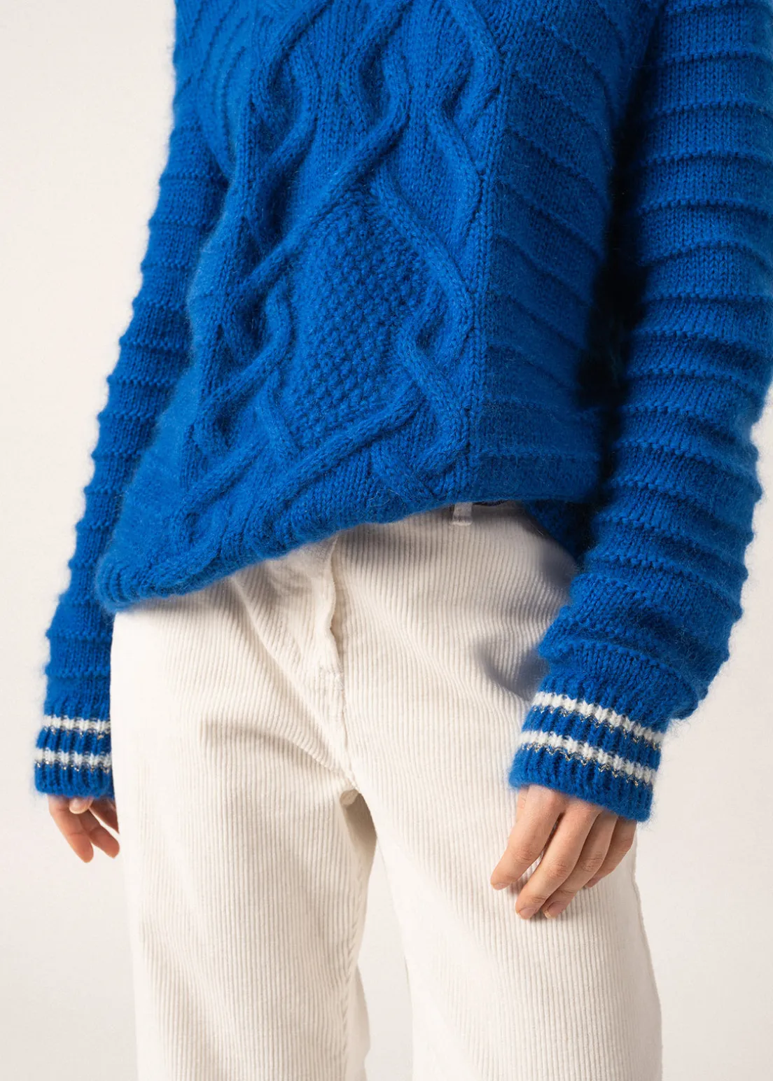 Knitted in our Saint-James Ateliers, Normandy, the Alpes jumper is made in blended mohair, with a fluffy appearance. We love its wide cables on the body of the jumper, as well as the detail of its colourful stripes at the cuffs.- Jumper
