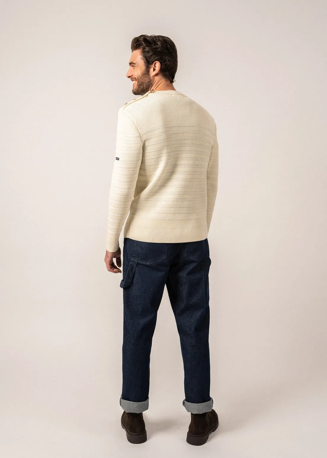 With its tonal stripes, the Binic Cap is the ideal model for those who love maritime style but want to maintain elegance and discretion. Knitted in our Ateliers in the same wool as our Marée jumpers, it is soft, warm, and comfortable. On the shoulder, its golden buttoning adds a touch of fantasy, enhancing the elegance and chic of its tone on tone stripes.- Sailor jumper