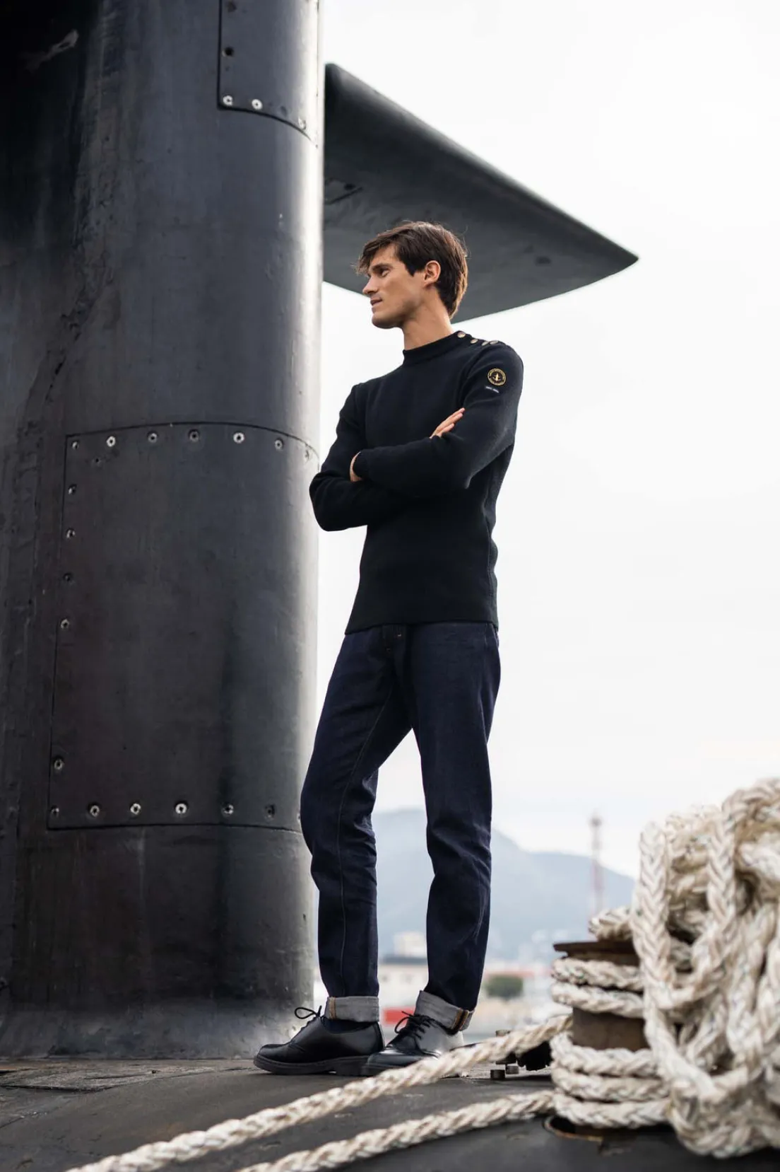 With the black version of the Compas jumper, immerse yourself in the world of French Navy submarine forces. The black and gold “Submarine Forces” felt patch gives all its character to this pure wool garment which features all the codes of the sailor jumper: remeshed round neck, cuffs at the bottom of the sleeves and old gold “National Navy” buttons on one shoulder.Made in France.- Authentic sailor jumper