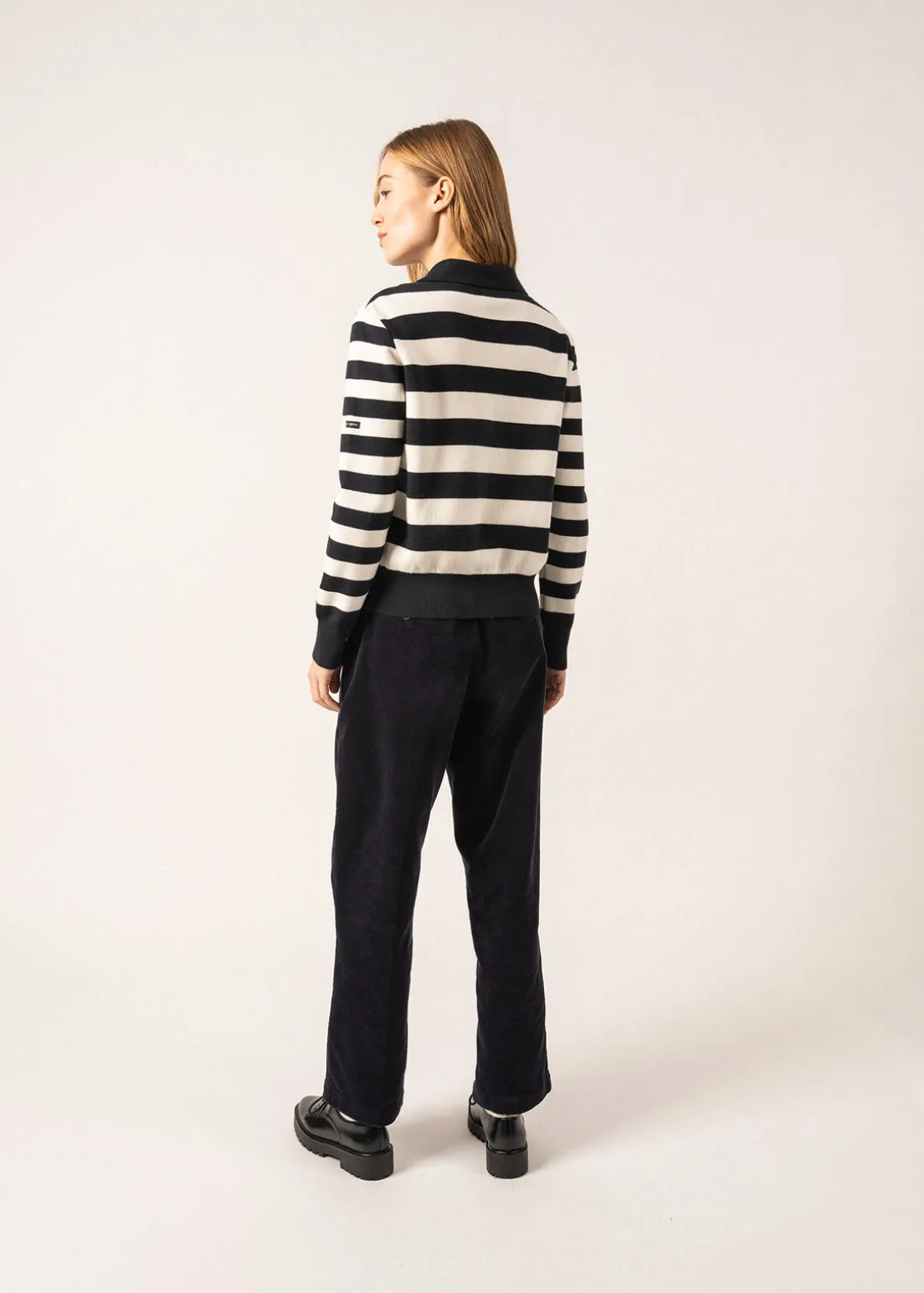 Knitted in Ponti, the Galway vest presents elegance and structure. We love its play of stripes, wider on the body, recalling our marine heritage. Made from a blend of cotton and cashmere, it is both lightweight, soft and comfortable.- Striped waistcoat
