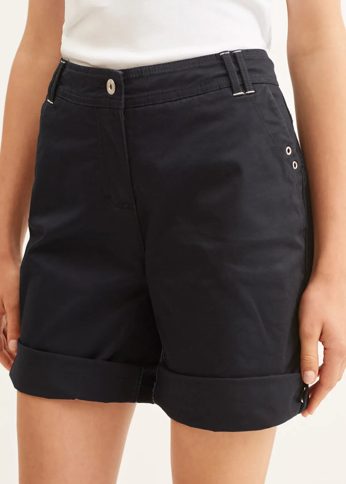 Gabardine Bermuda shorts. Fancy line cuts. Buttoned tab on lower leg to shorten the Bermuda shorts. Double belt loops. Decorative eyelets on pockets.
