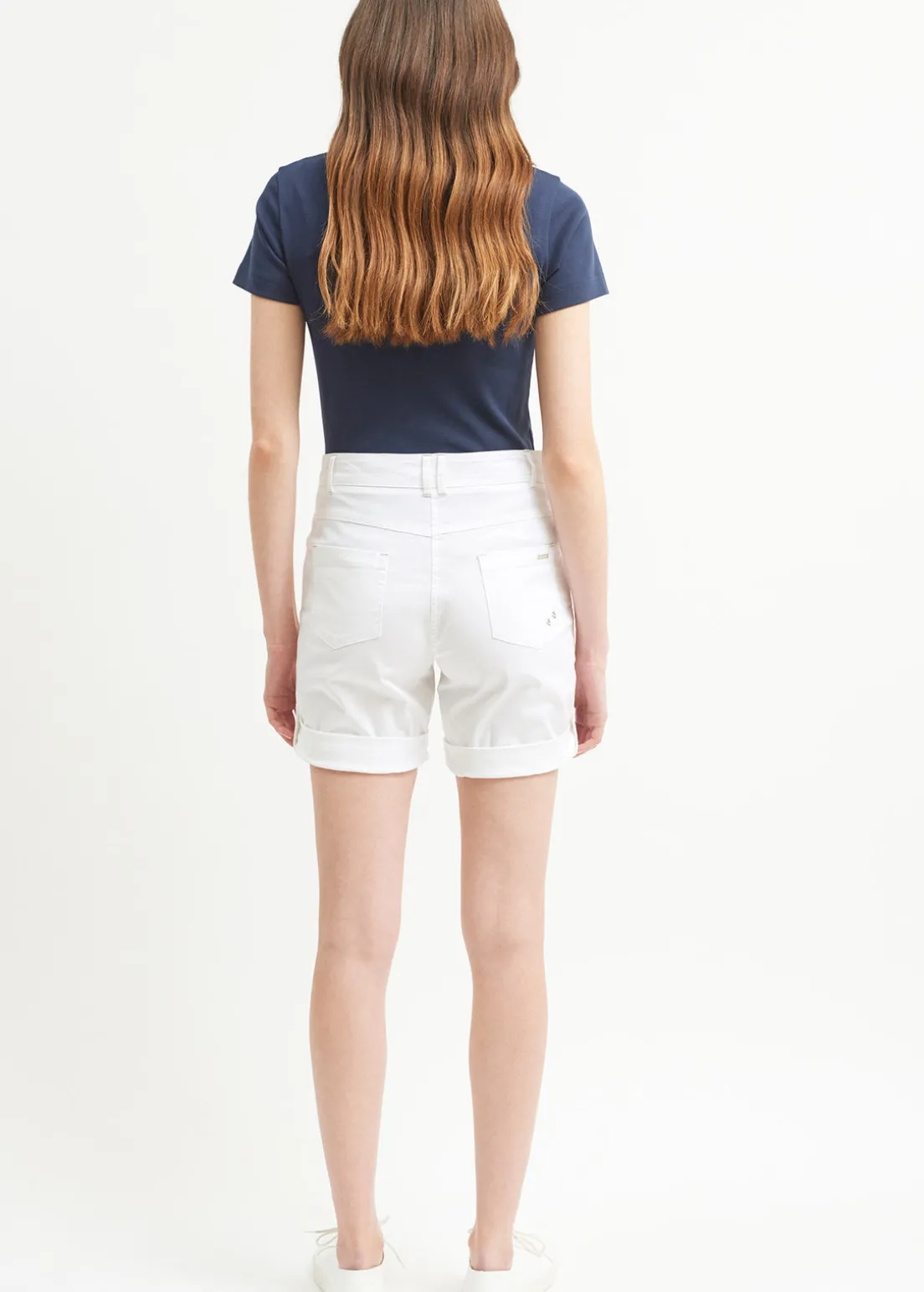 Gabardine Bermuda shorts. Fancy line cuts. Buttoned tab on lower leg to shorten the Bermuda shorts. Double belt loops. Decorative eyelets on pockets.