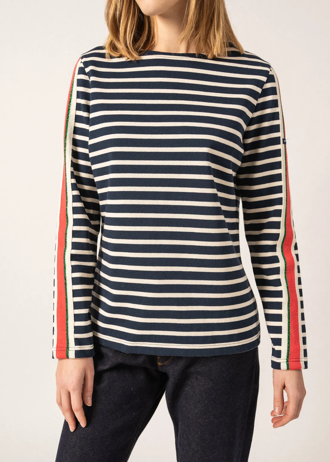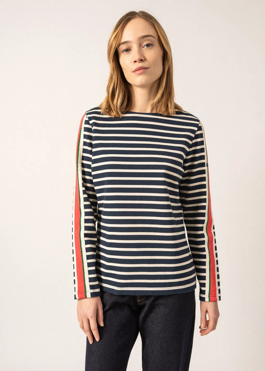 The Méridame Rendez-Vous sailor striped shirt is a true revisited basic. It is made of combed cotton, in a sober and timeless colour. On the sleeves, a contrasting tricolour band adds a touch of originality and colour to the ensemble, for a classic sailor striped shirt with a twist!- Jersey