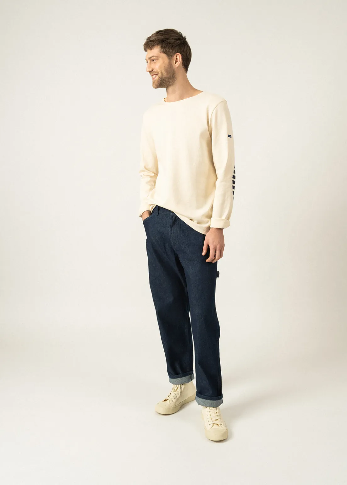 Fashioned after our Méridien Moderne Original Striped Shirt, this new take on the Sailor Shirt in carded heavyweight cotton features a solid body with striped elbow patches for extra “workwear” credit.- Carded cotton jersey