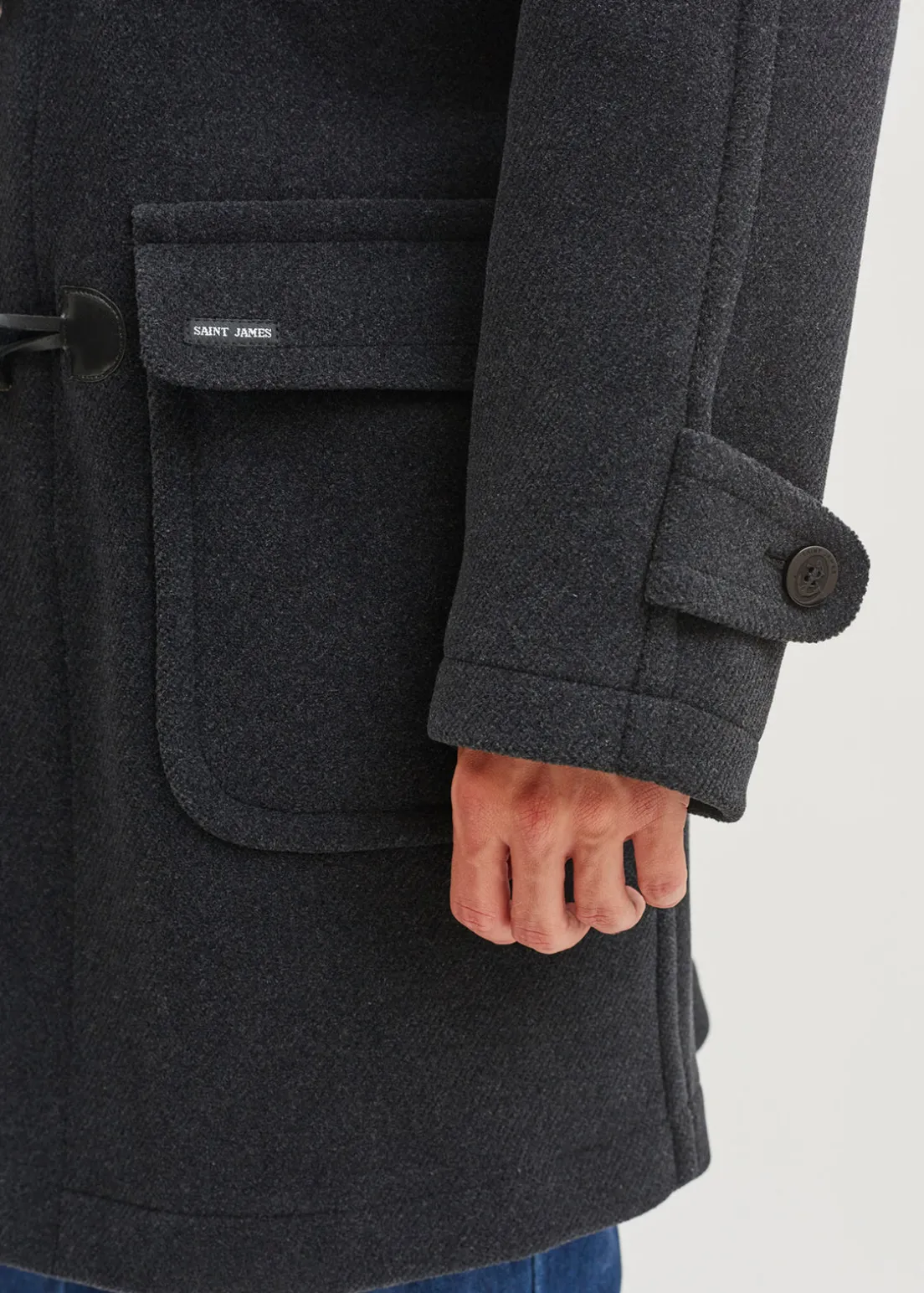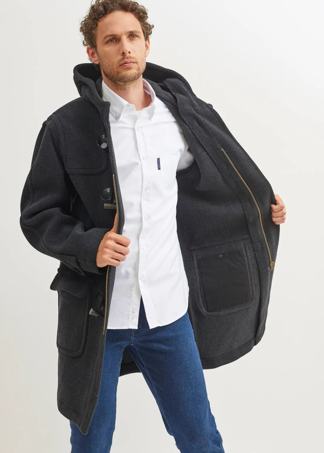 Classic duffle-coat. Applique detail on upper body. Zip fastening with horn and leather toggle. Patcj pockets with flap, inside patch pocket with button. Button fastening cuff tab. Inner neck tape.