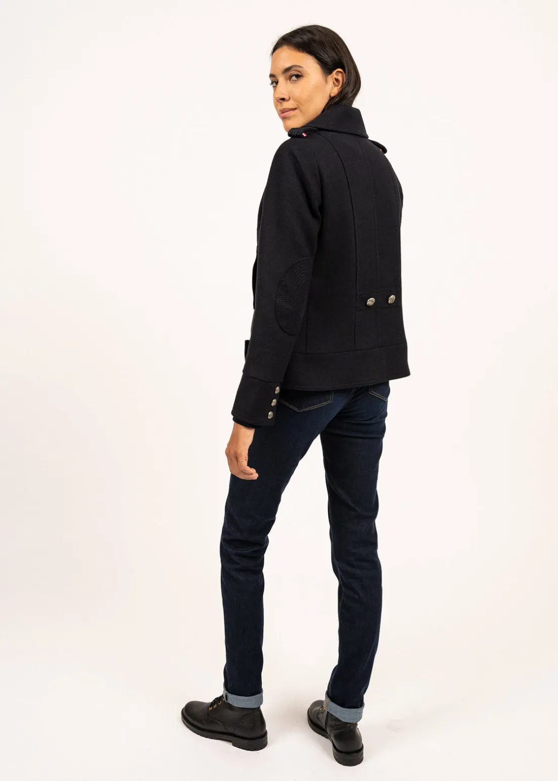 Short wool peacoat. Double-breasted with metal buttons featuring anchor detailing. Overstitched elbow patches. Small shoulder tabs with inner braid and sailor knot embroidery on top. Martingale detail at the back with 2 buttons. Semi-padded lining with an inner buttoned jacket.- Slim fit