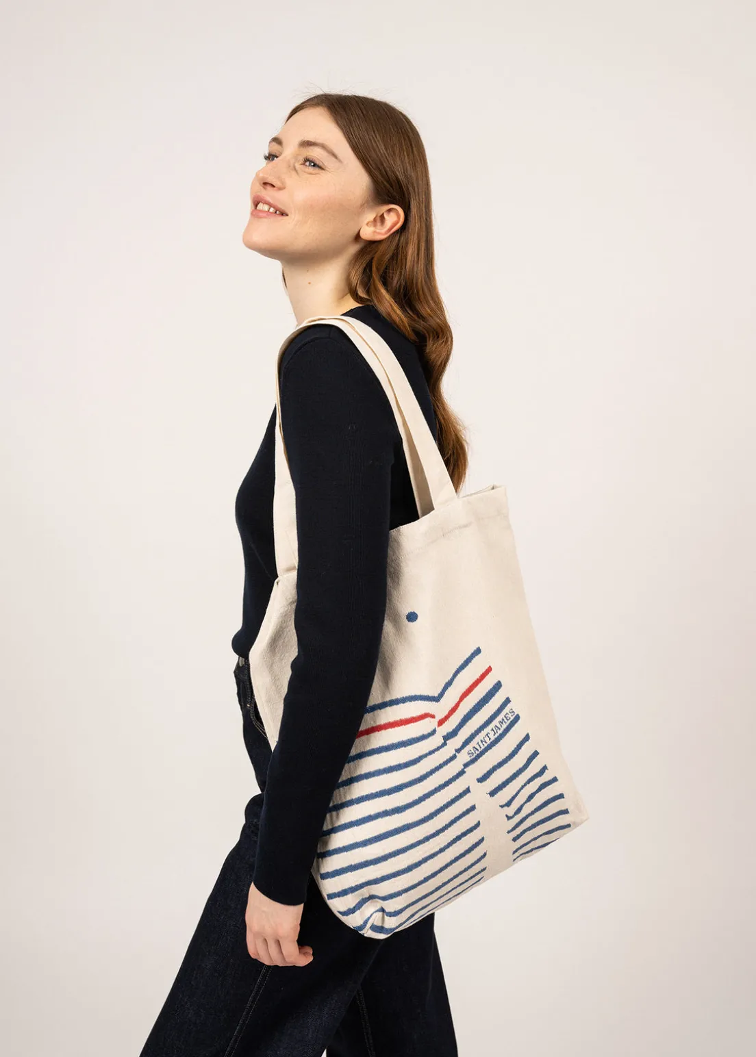 Essential, the tote bag is great to store your jacket, bottle, notebook and more. With its sailor striped shirt print on front, this bag celebrates our staple piece and marine background.