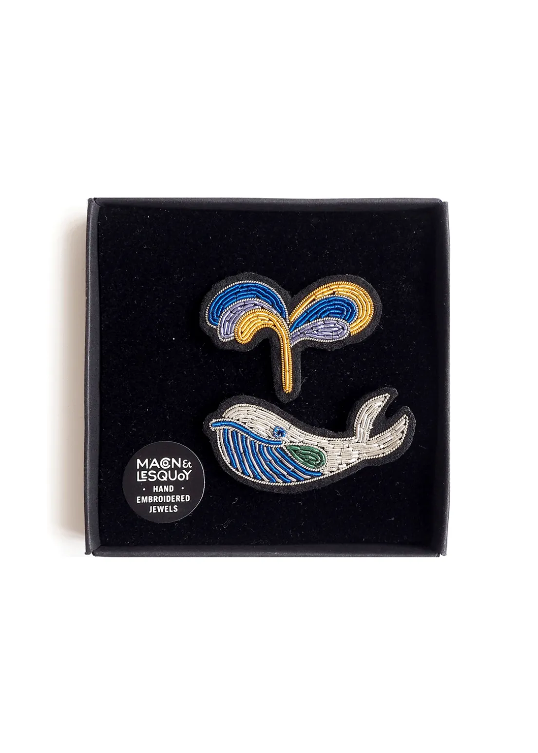 Poetic and original, this lovely brooch represents a whale and its spout. Delicate and handmade, this Macon & Lesquoy creation was exclusively designed for SAINT JAMES.- Bullion thread
